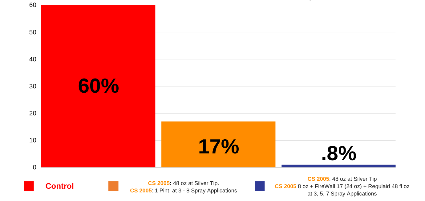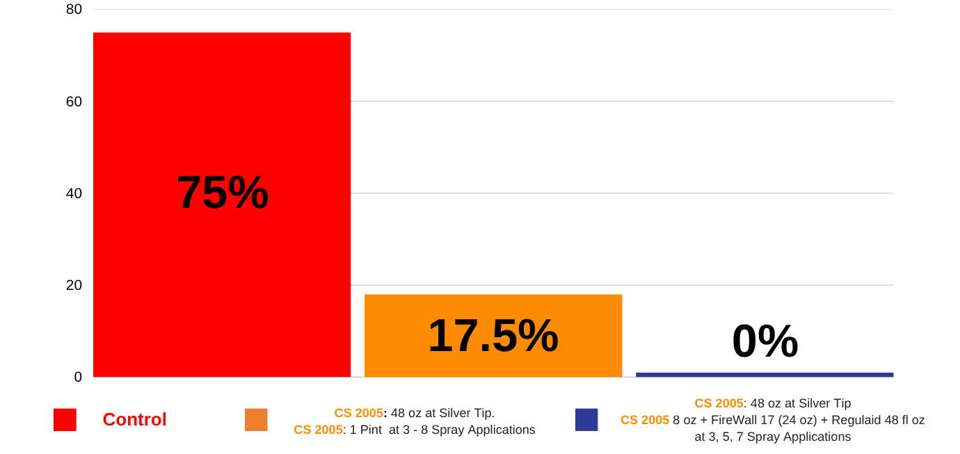 Similar results were seen for shoot blight, with the CS 2005 + FireWall + Regulaid combination delivering 100% control in structured application protocols.