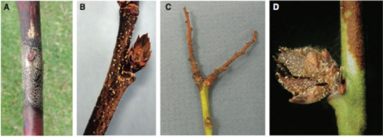 A) Cane canker caused by Colletotrichum acutatum with acervuli in concentric circles around leaf scar. B) Spore masses on a blueberry twig. C) Spore masses on old fruit spurs. D) Spore masses on flower bud scales. Photo by Tim Miles, MSU.