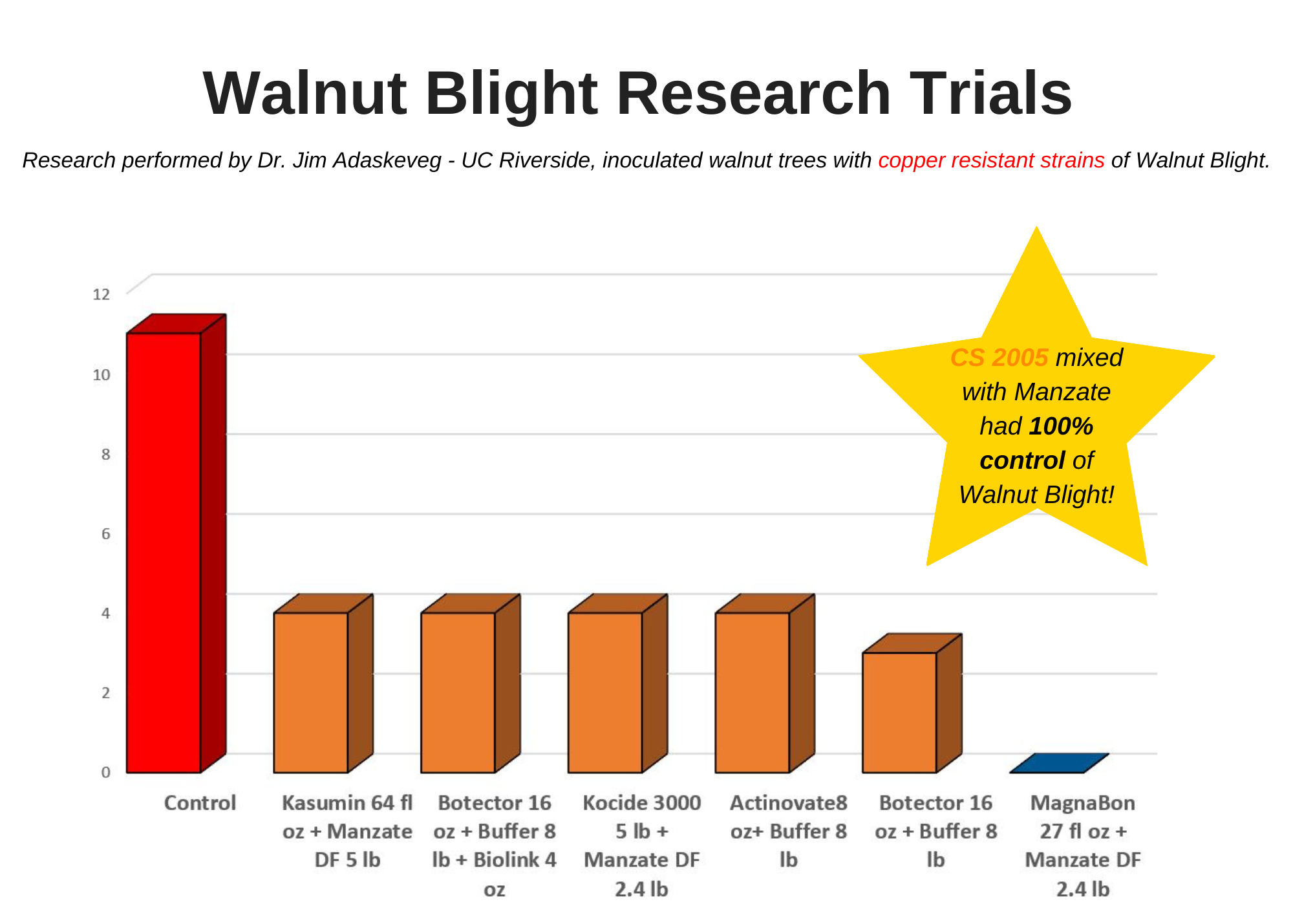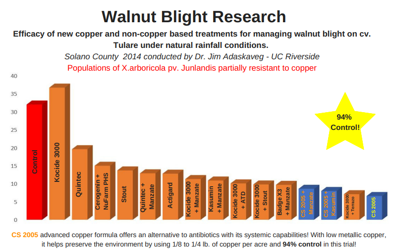 Trial Design: Led by Dr. Jim Adaskaveg, walnut trees were inoculated with copper-resistant strains and treated with four sprays between April and May. (4/6, 4/14, 4/23, 5/1)